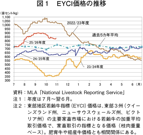 豪州食肉家畜生産者事業団(MLA)によると、肉牛生体取引価格の指標となる東部地区若齢牛指標(EYCI)価格は、2025年9月上旬以降緩やかな下降傾向が続いており、直近同年10月29日時点では、1キログラム当たり825豪セント(850円:1豪ドル=103.07円(注))となった(図1)。現地報道によると、ニューサウスウェールズ(NSW)州南部およびビクトリア(VIC)州での降雨量の減少により、牧草の確保が困難と判断した生産者による出荷の増加が価格下落の一因とされている。