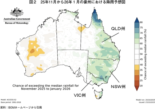 一方、豪州東部地域における10月27日の週の豪雨で、EYCI価格の下落は落ち着きを見せている。また、今後の見通しについて、現地アナリストによると、豪州気象局(BOM)の予報で25年11月から26年1月にかけ、主要肉用牛生産地域であるクイーンズランド(QLD)州、NSW州での平年以上の降雨があり、牧草の生育環境の改善が見込まれることから、家畜の早期出荷の動きは落ち着き、価格も安定すると分析している(図2)。