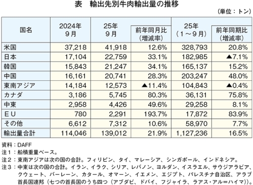 25年9月の牛肉輸出量、日本向けが前年同月比33.1%増加