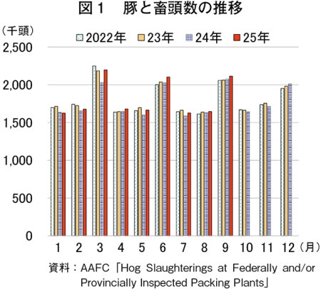 カナダ農務・農産食品省(AAFC)によると、2025年9月の豚と畜頭数は211万3000頭(前年同月比1.8%増)、同年1〜9月の累計では、カナダ西部のマニトバ州における豚肉大手加工施設の稼働率上昇や、廃用母豚のと畜能力向上などから、1633万1000頭(前年同期比2.8%増)といずれもわずかに増加した(図1)。
