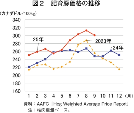 AAFCによると、2025年9月の肥育豚価格は、米国の肥育豚価格(注1)が上昇している中で、100キログラム当たり301カナダドル(1キログラム当たり336円:1カナダドル=111.79円(注2)、前年同月比21.3%高)と大幅に、同年1〜9月の平均価格は同278カナダドル(1キログラム当たり311円、前年同期比11.2%高)とかなり大きく、いずれも上昇した(図2)。