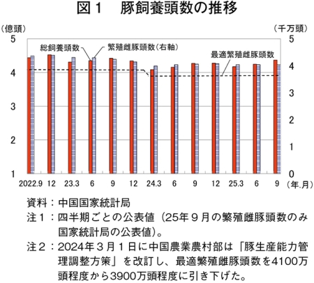 中国農業農村部によると、2025年9月末時点の繁殖雌豚頭数は4035万頭(前年同月比0.7%減、前期(25年6月)比0.2%減)と前年同月をわずかに下回ったものの、前期並みとなった(図1)。同頭数は、同部が最適な飼養水準(以下「最適水準」という)とする3900万頭を3.5%上回っている。