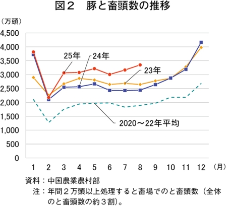 2025年8月の豚と畜頭数は、3350万頭(前年同月比37.2%増)と大幅に増加した(図2)。農業農村部が同年10月に公表した「農産物需給動向分析月報」(以下「月報」という)によると、25年上半期に繁殖雌豚頭数が最適水準を上回ったことによる子豚出生数増加に加え、同期間中の出荷先延ばし分や二次肥育(注1)による大型生体豚の出荷頭数増加が要因とされている。