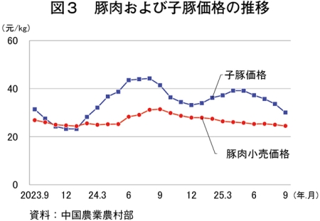 豚肉価格は、2024年10月から下落に転じており、25年9月の豚肉小売価格は、1キログラム当たり24.5元(338円:1元=21.97円(注2)、前月比1.9%安、前年同月比22.0%安)と安値で推移している(図3)。この要因について、月報によると、二次肥育による大型生体豚の出荷頭数増加などで市場への豚肉供給量が増加した一方、豚肉消費の鈍化が継続したためとされている。