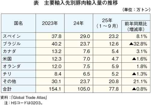 2025年1〜9月の豚肉輸入量は、77万7927トン(前年同期比0.8%減)と前年同期をわずかに下回った(表)。この要因として、国内供給量が十分で、国内豚肉価格も安値で推移しているため、輸入豚肉の価格優位性が相対的に弱まったことが考えられる。
