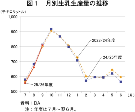 この結果、25/26年度(7月〜翌6月)の9月までの生乳生産量は、202万6671キロリットル(208万7471トン相当、前年同期比2.3%減)とわずかに減少した。