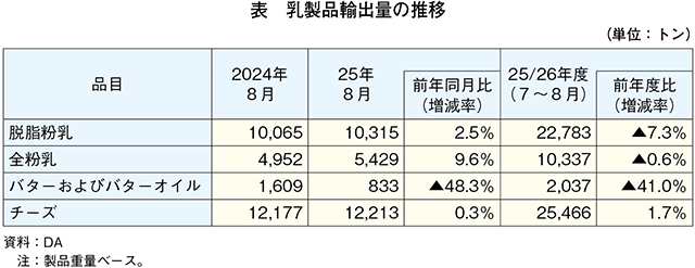 25年8月の主要乳製品の輸出量、バターおよびバターオイル除き増加