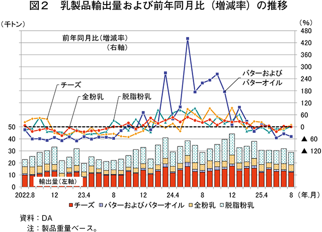 DAが2025年10月に公表した「Dairy Export Summary」によると、25年8月の主要乳製品4品目の輸出量は、バターおよびバターオイルを除き増加した(表、図2)。