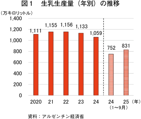 アルゼンチン経済省によると、2025年1〜9月の生乳生産量は830万8000キロリットル(855万7240トン相当、前年同期比10.5%増)と干ばつの影響下にあった前年同期をかなりの程度上回った(図1)。