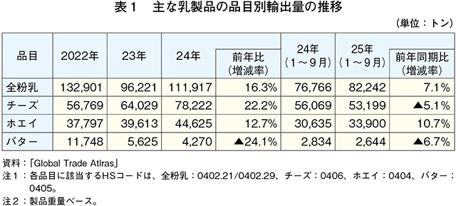2025年1〜9月の主な乳製品輸出量は、全粉乳(前年同期比7.1%増)およびホエイ(同10.7%増)が前年同期をかなりの程度上回った一方、チーズ(同5.1%減)およびバター(同6.7%減)は前年同期を下回った(表1)。