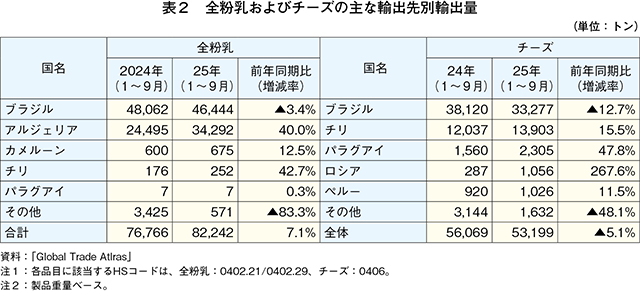 最大の輸出品目である全粉乳は、輸出先第1位のブラジル向けが4万6444トン(同3.4%減)、これに続くアルジェリア向けが3万4292トン(同40.0%増)と、この2カ国で全体の98.2%を占めた(表2)。また、チーズは、輸出先第1位のブラジル向けが3万3277トン(同12.7%減)、これに続くチリ向けが1万3903トン(同15.5%増)と、この2カ国で全体の88.7%を占めた。両輸出品目で輸出先第1位となっているブラジル国内では、生乳生産量が前年同期比で増加しており、乳製品の輸入量が減少している。