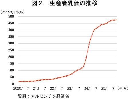 アルゼンチン経済省によると、2025年9月の生産者乳価は、1リットル当たり474.60ペソ(52円:1ペソ=0.11円(注)、前年同月比11.4%高)と前年度月をかなり大きく上回った(図2)。アルゼンチンの生産者乳価は、同国の高水準となるインフレ率を背景に上昇傾向にあった。24年4月に292.2%を記録したインフレ率は、その後低下傾向となり、25年9月に31.8%となった。これに連動する形で、生産者乳価の急激な上昇は落ち着いたものの、依然として緩やかな上昇傾向で推移している。