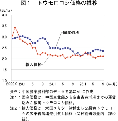 輸入トウモロコシ価格を見ると、養豚主産地の中国南部向け飼料原料集積地となる広東省黄埔港到着価格は、25年9月が前月同の1キログラム当たり2.12元(47円:1元=21.97円(注))となった。また、同月の国産トウモロコシ価格(東北部産の同港到着価格)が同2.36元(52円、同0.8%安)とわずかに下落したことで、輸入と国産の価格差は縮小した。