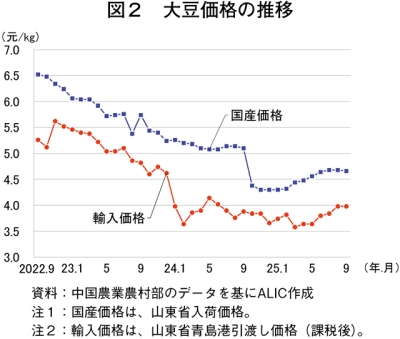 各地の価格動向を見ると、主産地である黒竜江省の食用向け国産大豆平均取引価格は、25年9月が1キログラム当たり4.08元(90円、前年同月比12.6%安)と前年同月をかなり大きく下回ったものの、3カ月連続で前月水準を維持した。また、大豆の国内指標価格の一つとなる山東省の国産大豆価格は、同4.66元(102円、同8.6%安)と前年同月をかなりの程度下回ったものの、前月水準を維持した。さらに、同月の輸入大豆価格は同3.98元(87円、前月比同)となり、輸入と国産の価格差は縮小した。