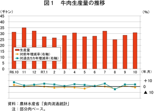 令和7年10月の牛肉生産量(注1)は、3万767トン(前年同月比1.5%減)と前年同月をわずかに下回った(図1)。品種別では、和牛は1万6278トン(同2.4%増)、交雑種は8210トン(同2.1%増)と、ともに前年同月をわずかに上回った一方、乳用種は6231トン(同13.6%減)と前年同月をかなり大きく下回った。