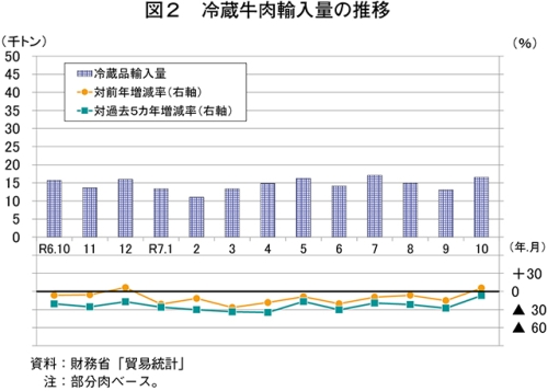 なお、過去5カ年の10月の平均輸入量との比較では、冷蔵品は6.9%減とかなりの程度下回った一方、冷凍品は8.6%増とかなりの程度上回る結果となった。