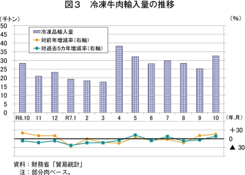 10月の輸入量について、冷蔵品では、米国産が現地価格の高止まりなどにより減少した一方、豪州産が増加したことなどから、1万6547トン(前年同月比5.5%増)と前年同月をやや上回った(図2)。冷凍品では、米国産ショートプレート(バラ)や豪州産のうち主に加工用のひき材などに使用されるトリミングの輸入量が増加したことなどから、3万2587トン(同15.5%増)と前年同月をかなり大きく上回った(図3)。この結果、輸入量の合計(注2)では、4万9168トン(同11.9%増)と前年同月をかなり大きく上回った。