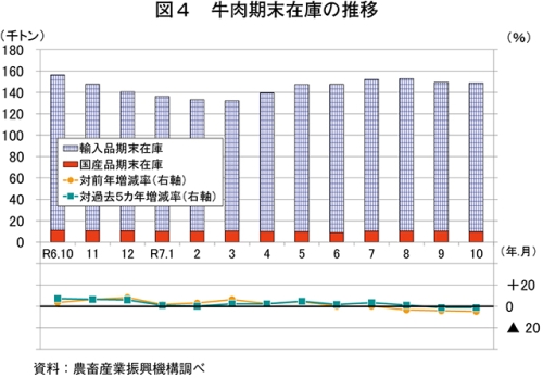 10月の推定期末在庫は、14万8721トン(前年同月比4.9%減)と前年同月をやや下回った(図4)。このうち、国産品は9824トン(同12.5%減)とかなり大きく、在庫の大半を占める輸入品は13万8897トン(同4.3%減)とやや、いずれも前年同月を下回った。
