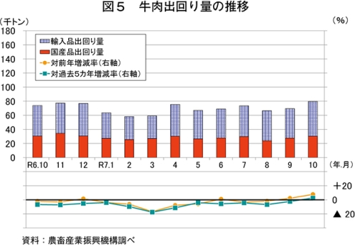 推定出回り量は、7万9606トン(同7.7%増)と前年同月をかなりの程度上回った(図5)。このうち、国産品は3万347トン(同0.4%減)と前年同月をわずかに下回った一方、輸入品は4万9258トン(同13.5%増)と前年同月をかなり大きく上回った。