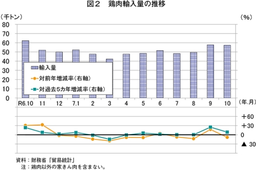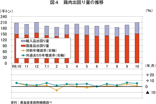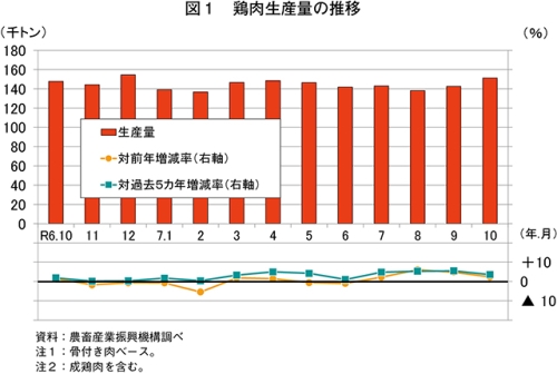 令和7年10月の鶏肉生産量は、15万1212トン(前年同月比2.4%増)と前年同月をわずかに上回った(図1)。