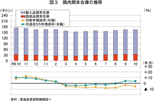 10月の推定期末在庫は、16万4307トン(前年同月比5.2%減)と前年同月をやや下回った(図3)。このうち、輸入品は12万9858トン(同8.0%減)と前年同月をかなりの程度下回った。
