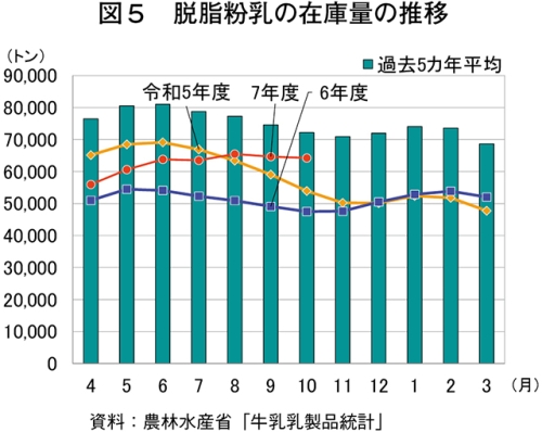 10月の脱脂粉乳の生産量は、1万1368トン(前年同月比7.0%増)と前年同月をかなりの程度上回った(図4)。一方、出回り量は1万1823トン(同3.2%減)と9カ月連続で下回った(農畜産業振興機構調べ)。10月末の在庫量は、6万4221トン(同35.2%増)と11カ月連続で上回った。(図5)。