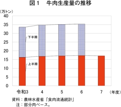 上半期の牛肉生産量は、17万1334トン(前年同期比1.0%減)と前年同期をわずかに下回った(図1)。品種別に見ると、和牛は9万605トン(同3.9%増)とやや、交雑種は4万6094トン(同1.5%増)とわずかに、いずれも前年同期を上回った。乳用種は3万4341トン(同12.7%減)と前年同期をかなり大きく下回り、和牛については和牛受精卵移植技術の活用により生産量が増加した一方、乳用種については引き続き減少傾向で推移し、全体では減少に転じた。