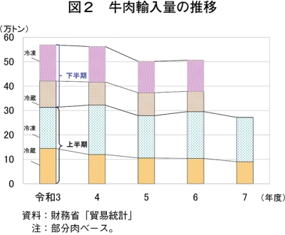 上半期の牛肉輸入量は、冷蔵品、冷凍品ともに減少したことから、27万2194トン(注1)(前年同期比7.9%減)と前年同期をかなりの程度下回った(図2)。
