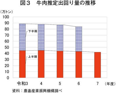 また、上半期(9月)の牛肉推定期末在庫は、14万9418トン(同4.1%減)と前年同期をやや下回った。このうち、輸入品は13万8987トン(同3.8%減)とやや、国産品は1万431トン(同7.7%減)とかなりの程度、いずれも前年同期を下回った。
