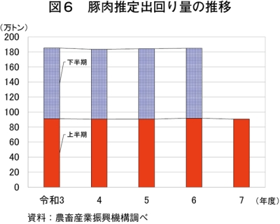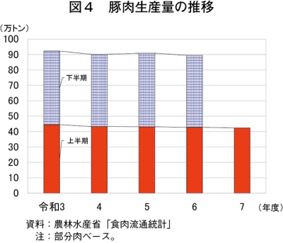 上半期の豚肉生産量は、猛暑の影響などによりと畜頭数が減少したことなどから、42万3770トン(前年同期比0.9%減)と前年同期をわずかに下回った(図4)。