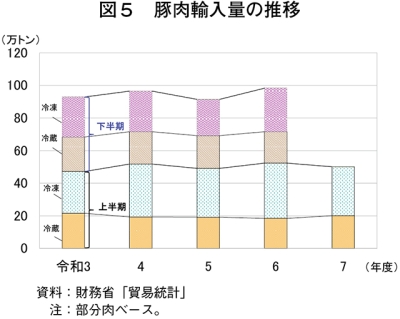 上半期の豚肉輸入量は、冷蔵品は増加した一方、冷凍品は減少したことから、50万1023トン(注2)(前年同期比4.3%減)と前年同期をやや下回った(図5)。
