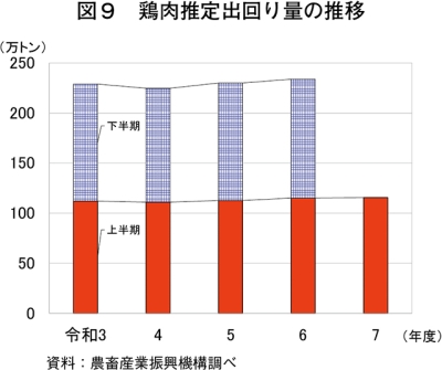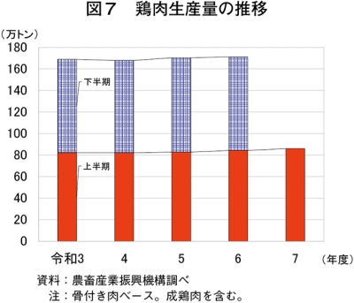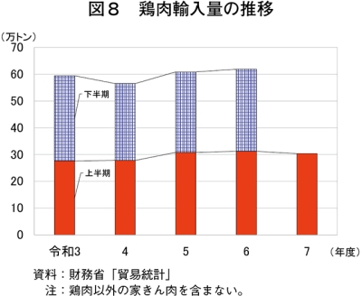 上半期の鶏肉生産量は、消費者の健康志向の持続などにより、86万55トン(前年同期比2.1%増)と前年同期をわずかに上回った(図7)。