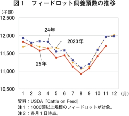 米国農務省全国農業統計局(USDA/NASS)によると、2025年9月および10月のフィードロット導入頭数はそれぞれ202万1000頭(前年同月比6.3%減)、203万9000頭(同10.0%減)といずれもかなりの程度減少し、さらに出荷頭数はそれぞれ163万2000頭(同3.9%減)、169万7000頭(同8.0%減)と減少した。この結果、同年11月1日時点のフィードロット飼養頭数は1170万6000頭(同2.2%減)とわずかに減少した(図1)。