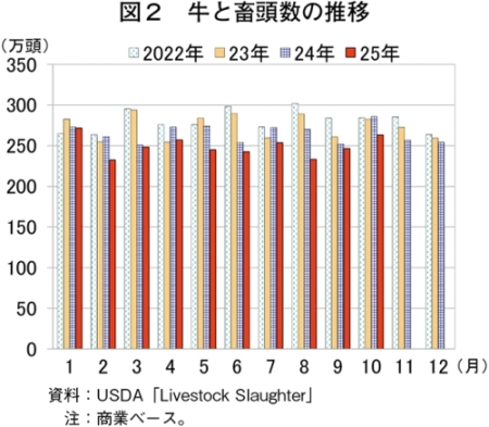 また、9月および10月の牛と畜頭数はそれぞれ246万5000頭(同2.3%減)、263万2000頭(同7.9%減)といずれも減少した(図2)。