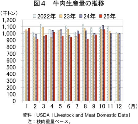 なお、1頭当たり枝肉重量はそれぞれ399.2キログラム(同2.1%増)、403.2キログラム(同2.4%増)とわずかに増加したが、牛肉生産量はそれぞれ97万9000トン(同2.2%減)、105万5000トン(同5.7%減)と減少した(図3、4)。25年の牛肉生産量についてUSDAは、1171万7000トン(前年比4.5%減)とやや減少すると見込んでいる。