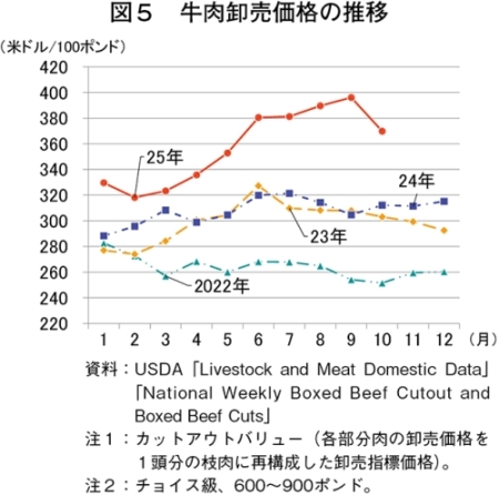 米国農務省経済調査局(USDA/ERS)および農業マーケティング局(AMS)の公表情報によると、2025年9月の牛肉卸売価格(カットアウトバリュー(注1))は、牛肉に対する堅調な需要と生産量の減少から、100ポンド当たり396.1米ドル(1キログラム当たり1376円:1米ドル=157.63円(注2)、前年同月比30.0%高)と前年同月を大幅に上回った。同年10月の牛肉卸売価格は、同369.8米ドル(同1285円、18.5%高)と前年同月を大幅に上回ったものの、前月からはかなりの程度下落(6.6%安)した(図5)。