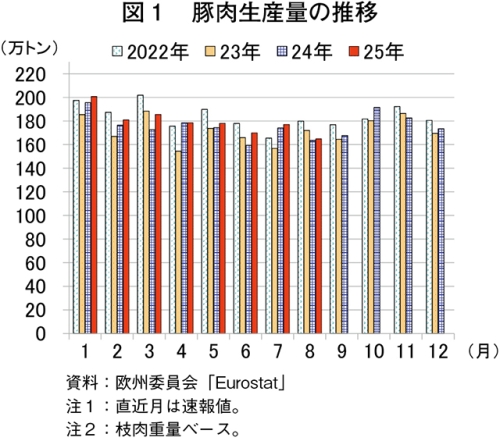 欧州委員会によると、2025年8月の豚肉生産量(EU27カ国)は165万トン(前年同月比0.9%増)とわずかに増加した(図1)。豚と畜頭数は1755万頭(同1.0%減)と前年同月をわずかに下回った一方、1頭当たりの枝肉重量が93.95キログラム(同1.9%増)とわずかに増加し、生産量の増加につながった。