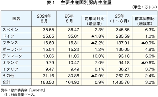 主要生産国別の状況を見ると、スペインはと畜用豚の域内からの輸入を増やし、同年1〜8月の豚肉生産量を前年同期比6.3%増加させた(表1)。デンマークは同期間の豚と畜頭数を5.6%増加させ、生産量も同5.6%増加した。同国の同年6月時点の豚飼養頭数は1189万頭(前年同月比5.6%増)、このうち繁殖用豚は115万頭(同0.5%増)と2年連続で増加している。
