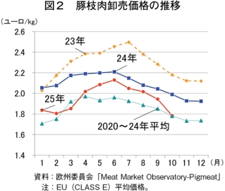 欧州委員会によると、2025年10月の豚枝肉卸売価格(EU27カ国)は、1キログラム当たり1.78ユーロ(326円:1ユーロ=183.1円(注1)、前年同月比10.4%安)となった(図2)。同価格は4カ月連続で前月を下回り、下落幅は拡大している。国別に見ると、中国向け輸出の多いスペインが同9.5%安となり、同国の価格下落が域内全体の価格に下落圧力を与えた。ドイツ(同11.4%安)、フランス(同8.8%安)およびポーランド(同14.6%安)の同価格も軒並み下落した。