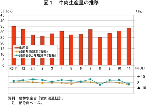 令和7年11月の牛肉生産量(注1)は、3万3324トン(前年同月比4.7%減)と前年同月をやや下回った(図1)。品種別では、和牛は1万8801トン(同2.0%減)とわずかに、交雑種は8691トン(同2.1%減)とわずかに、乳用種は5786トン(同15.6%減)とかなり大きく、いずれも前年同月を下回った。
