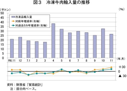 11月の輸入量について、冷蔵品では、国内需要が低調な中、現地価格の高止まりなどにより、主要輸入先を含むほとんどの輸入先からの輸入量が減少したことなどから、1万2116トン(前年同月比11.1%減)と前年同月をかなり大きく下回った(図2)。冷凍品では、米国産ショートプレート(バラ)や豪州産のうち主に加工用のひき材などに使用されるトリミングの輸入量が増加したことなどから、2万6568トン(同26.9%増)と前年同月を大幅に上回った(図3)。この結果、輸入量の合計(注2)では、3万8712トン(同12.0%増)と前年同月をかなり大きく上回った。