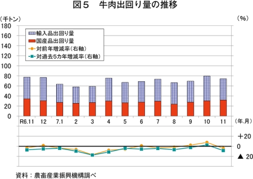 推定出回り量は、7万4180トン(同4.0%減)と前年同月をやや下回った(図5)。このうち、国産品は3万1971トン(同7.1%減)とかなりの程度、輸入品は4万2210トン(同1.5%減)とわずかに、いずれも前年同月を下回った。