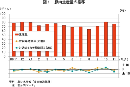 令和7年11月の豚肉生産量は、7万6416トン(前年同月比2.5%減)と前年同月をわずかに下回った(図1)。