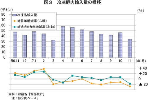 11月の輸入量について、冷蔵品は、価格や規格などで一定の評価を受けるカナダ産が増加したことなどから、3万801トン(前年同月比1.2%増)と前年同月をわずかに上回った(図2)。冷凍品は、現地相場高や為替相場の影響、国内の輸入品在庫が依然として高水準にあったことなどから、3万4465トン(同27.9%減)と前年同月を大幅に下回った(図3)。この結果、輸入量の合計(注1)では、6万5268トン(同16.6%減)と前年同月を大幅に下回った。