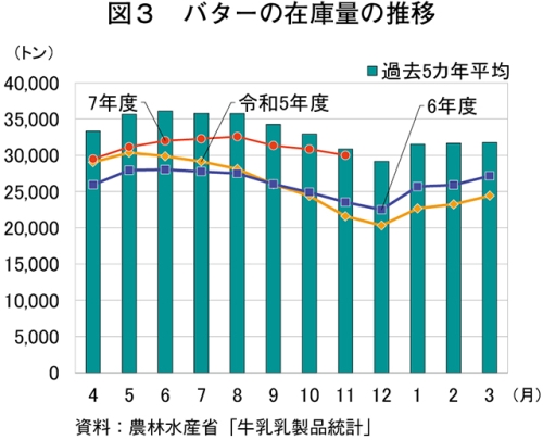 11月のバターの生産量は5512トン(前年同月比10.7%増)と、9カ月連続で前年同月を上回った(図2)。一方、出回り量は7462トン(同13.4%減)と、6カ月連続で下回った(農畜産業振興機構調べ)。在庫量については、15カ月連続で前年同月を上回り、11月末は2万9993トン(同27.5%増)となった(図3)。