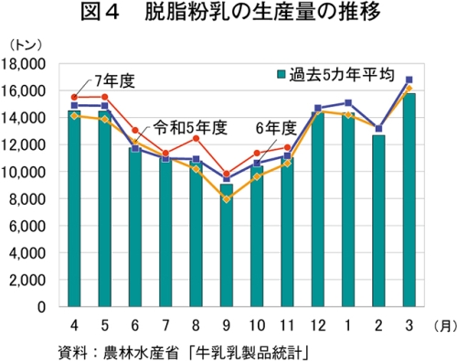 11月の牛乳等生産量を見ると、飲用牛乳等のうち牛乳は、25万133キロリットル(前年同月比3.0%減)と4カ月連続で前年同月を下回った。成分調整牛乳は前年割れが継続しており、1万5872キロリットル(同6.4%減)となった。また、加工乳については、1万2757キロリットル(同7.2%減)と4カ月連続で前年同月を下回った。