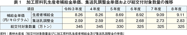 令和7年12月22日に開催された「食料・農業・農村政策審議会畜産部会」において、畜産物価格の算定について諮問・答申が行われ、加工原料乳生産者補給金単価は前年度から0.02円引き上げとなる1キログラム当たり9.11円、集送乳調整金単価は同0.10円引き上げとなる同2.83円、総交付対象数量は前年度同の325万トンと定められた(表)。また、畜産物価格関連対策の1つとして、総交付対象数量を超えた部分の数量(25万トンを上限)について、バターと脱脂粉乳の需給の不均衡を改善するため、また、総交付対象数量に25万トンを加えた350万トンについて、物流問題による集送乳経費の合理化に資するために、生乳流通事業者等が行う取り組みを支援する措置が令和8年度も引き続き講じられる予定である。
