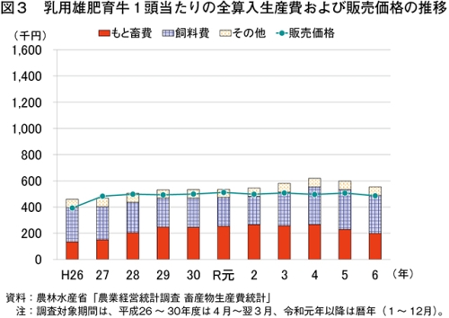 令和6年の乳用雄肥育牛1頭当たりの全算入生産費は、55万3847円(同7.5%減)と前年をかなりの程度下回った(表1、図3)。