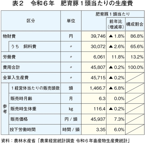【肥育豚生産費】飼料費が減少した一方、労働費が増加し、生産費は前年並み