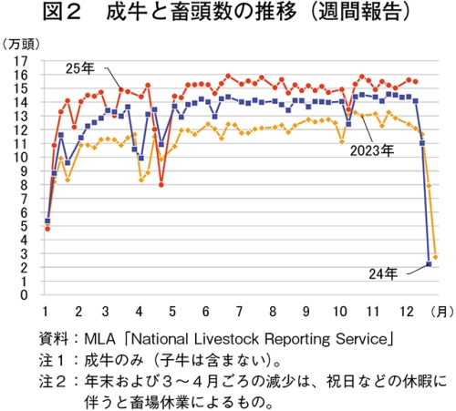 2025年12月の週間成牛と畜頭数は、引き続き堅調を維持しており、12月第2週は15万4861頭(前年同期比10.0%増)を記録した(図2)。牛肉輸出が堅調なことに加え、クリスマス休暇前の駆け込み需要により、と畜頭数は例年より高水準で推移している。現地報道によると、大半の食肉加工業者が26年1月分と畜の予約受付を開始しており、年始も順調とされている。